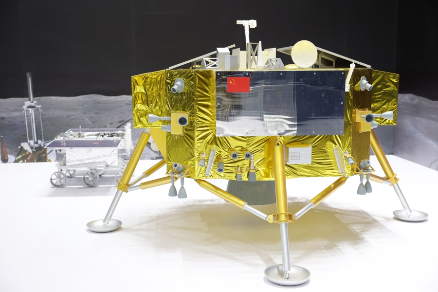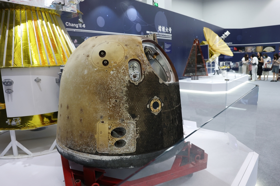 嫦娥五号返回器、降落伞和钻取采样装置均亮相本次展览。